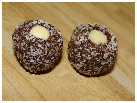 Žloutky rozmačkáme spolu s máslem, cukrem, rumem, kakaem a kokosem. Vypracujeme těsto a necháme ztuhnout v lednici. Potom tvoříme kuličky, které obalujeme v kokosu a do každé uděláme jamku, do které nalijeme rozpuštěnou bílou čokoládu (s trochou ztuženého tuku) a necháme ztuhnout.